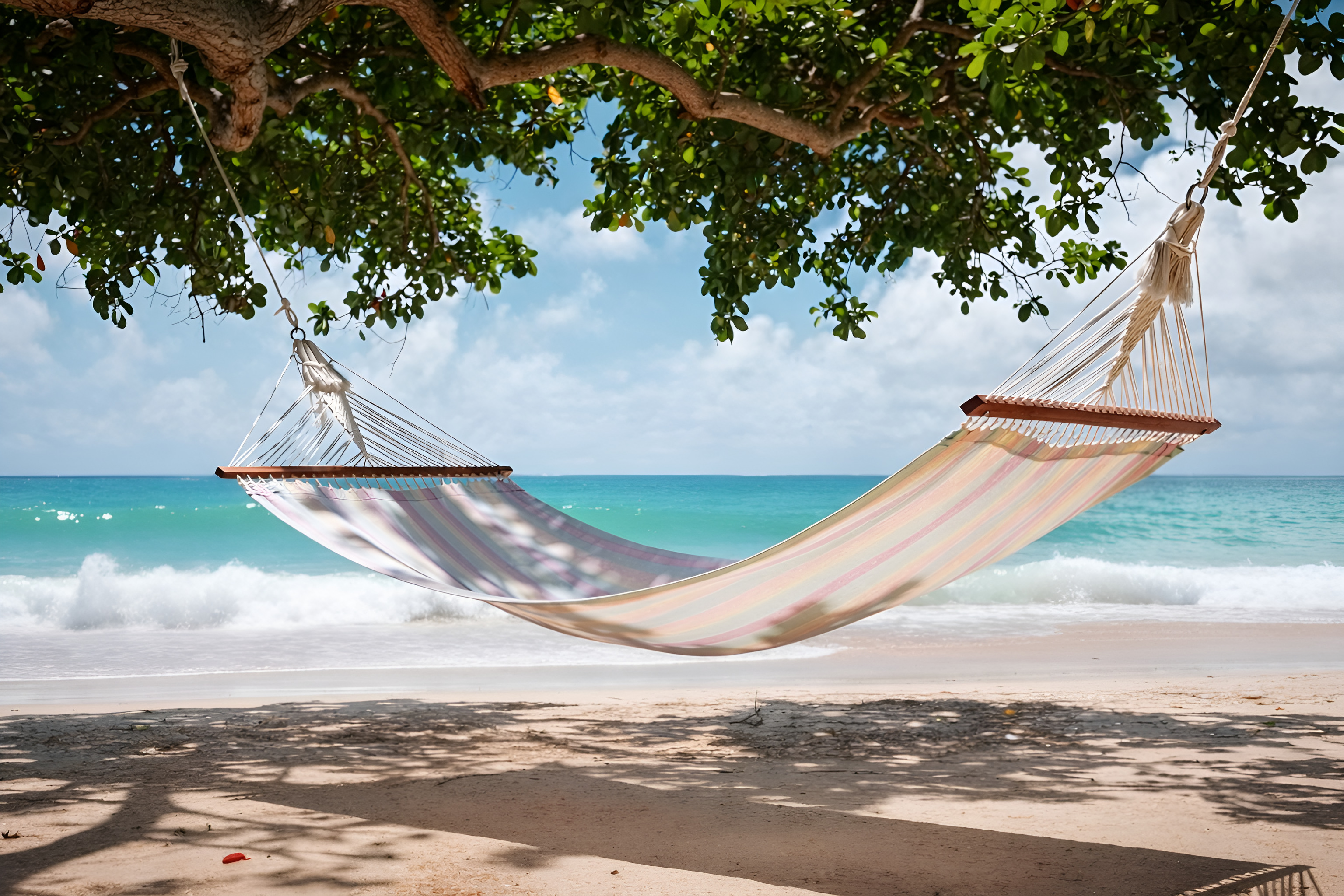 OUTDOOR FURNITURE: TWO LOUNGE CHAIRS WITH CUSHIONS, TWO SIDE TABLES, HAMMOCK, PERGOLA WITH SUNSHADE.