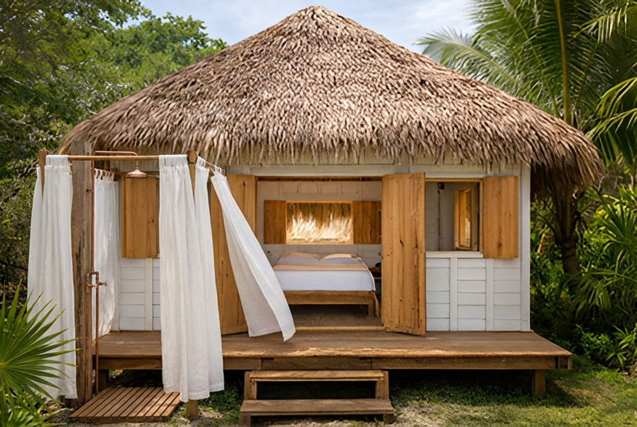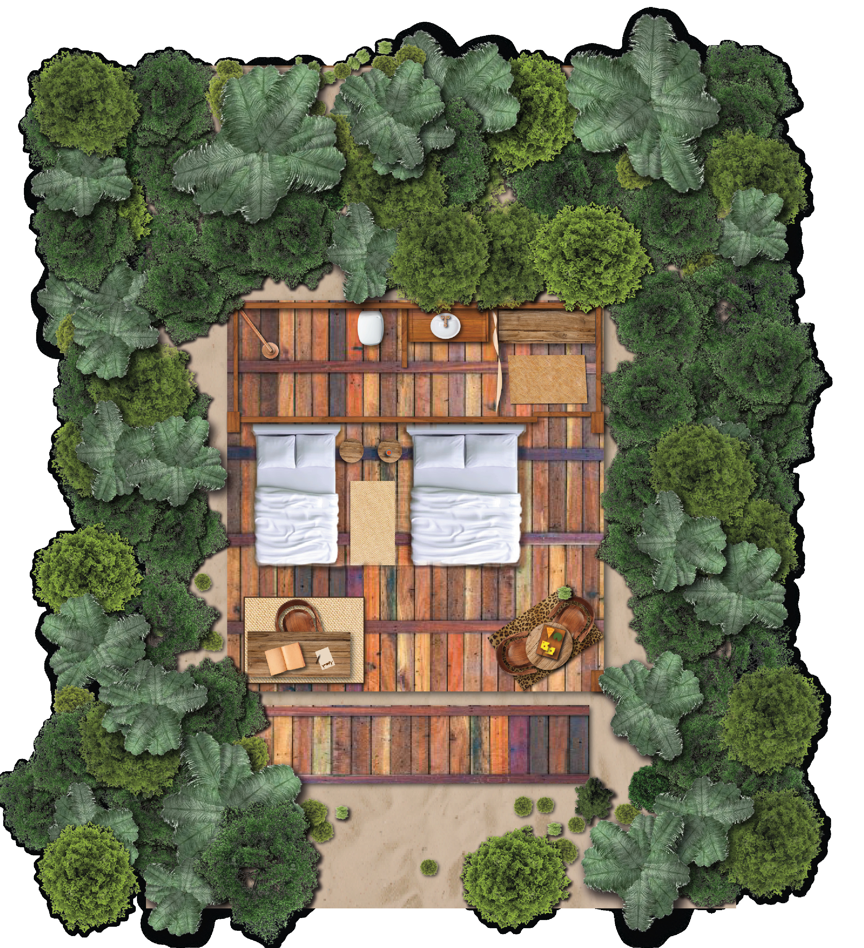 INTERIOR FURNITURE: ELECTRICITY, AC, ONE QUEEN BED WITH SIDE TABLE, TWO SINGLE BEDS OR BUNK BEDS, CLOSET, MULTIPURPOSE TABLE WITH TWO CHAIRS AND DESK STATIONERY KIT, PRIVATE BATHROOM WITH OUTDOOR SHOWER, BATH TOWEL AND HAND TOWEL (ONE PER PERSON).