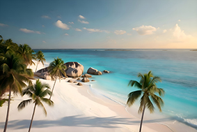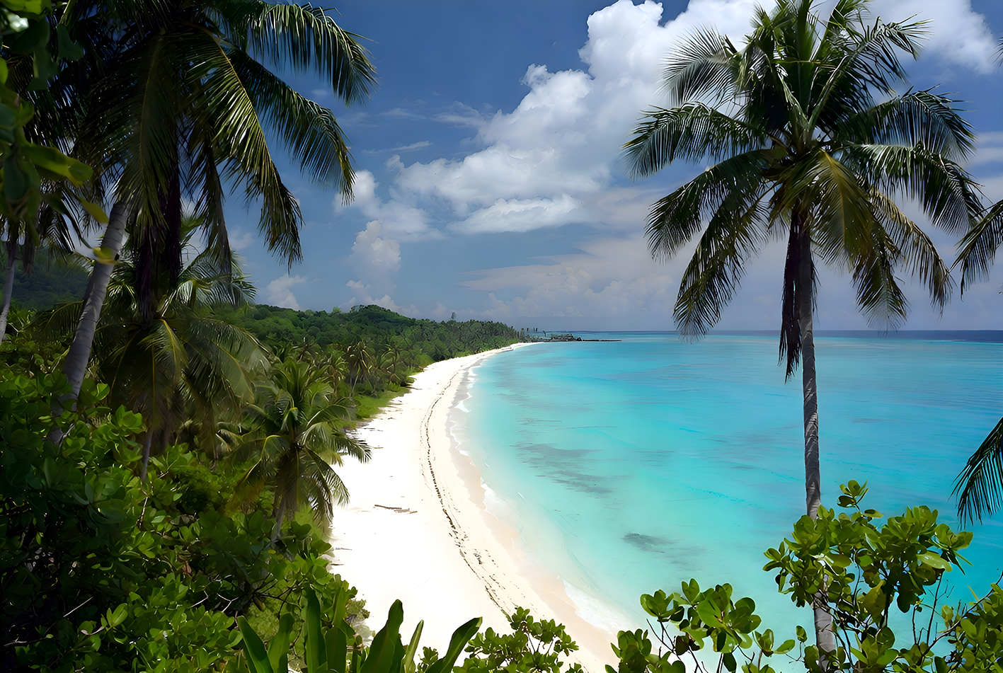 "WHITE SANDS TURQUOISE SEAS PALM TREES SUN"
